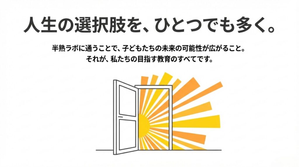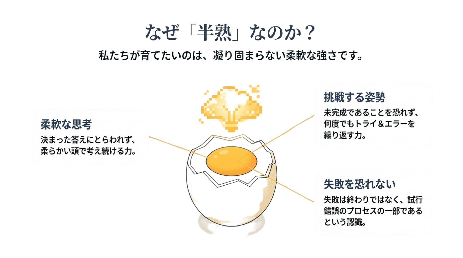 子どもたちが、自分の“好き”を活かして未来を切り拓く場所。半熟ラボは、マインクラフトやスクラッチなどのツールを使って、プログラミング・IT・プレゼン・起業体験・地域連携など、実社会につながる学びを提供する探究型の教室です。教室名の「半熟」には、こんな想いが込められています。子どもの頃は、わんぱくで何にでも挑戦できたのに、大人になるにつれて、いつの間にか思考や行動が制限されていく。そんな変化の中でも、「いつまでも挑戦する気持ちを忘れず、思考を凝り固めずに進んでいってほしい」。その願いが「半熟」という名前に込められています。学校でも塾でもない、「学びの第3の居場所」。正解よりも、挑戦と発信を。評価よりも、プロセスと成長を。まだ固まりきっていないからこそ伸びしろがある。そんな半熟な子どもたちの可能性を、全力で応援していきます。