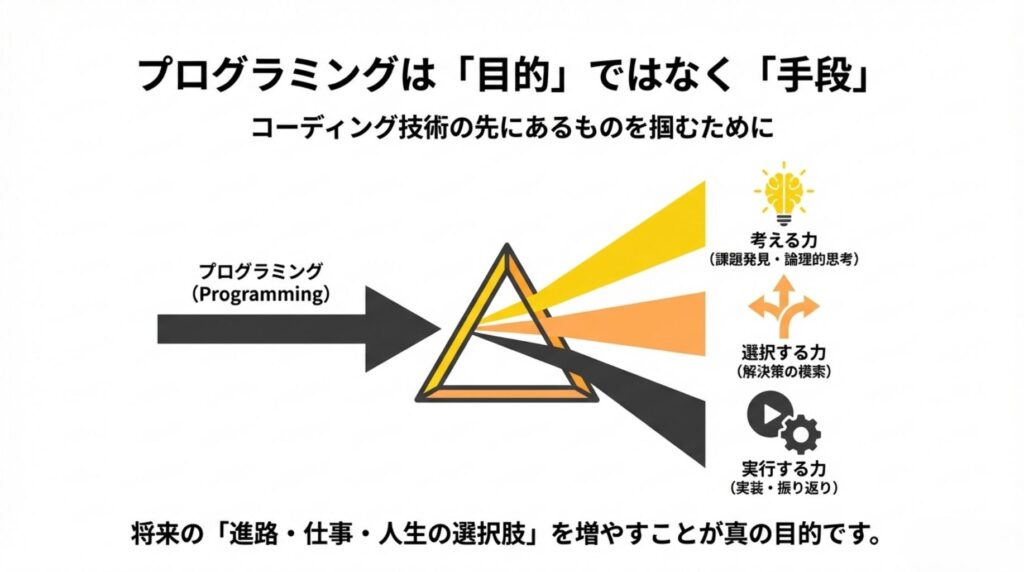 プログラミングを通して、「自分の頭で考える力」や「自分の力で問題を乗り越える力」を身につけてほしいと思っています。それは、将来どんな道に進んでも、きっと君たちの助けになるからです。みんなにプログラマーになってほしいとは思っていません。でも、考えることを楽しめる人、挑戦することをおもしろいと思える人になってほしい。そうすれば、どんな人生でもきっと楽しくなるはずです。