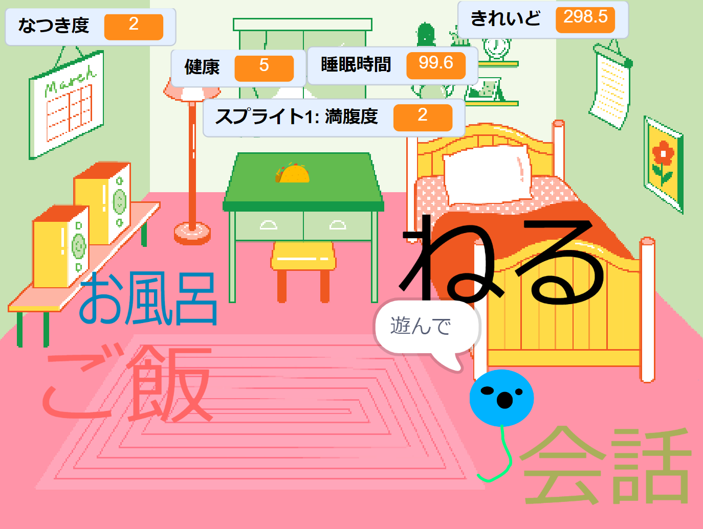 画面中央の卵を育てていくというシンプルな仕組みの中に、「食事」「汚れ」「シャワー」といった要素をうまく組み込み、ゲーム全体の流れがとても分かりやすく作られていました。汚れがたまるとご飯を食べられなくなるなど、状態によって行動が制限される仕組みは、プログラミング的な考え方がしっかり身についていることを感じさせます。卵から成長していくという「変化」のテーマも明確で、完成度の高い作品でした。