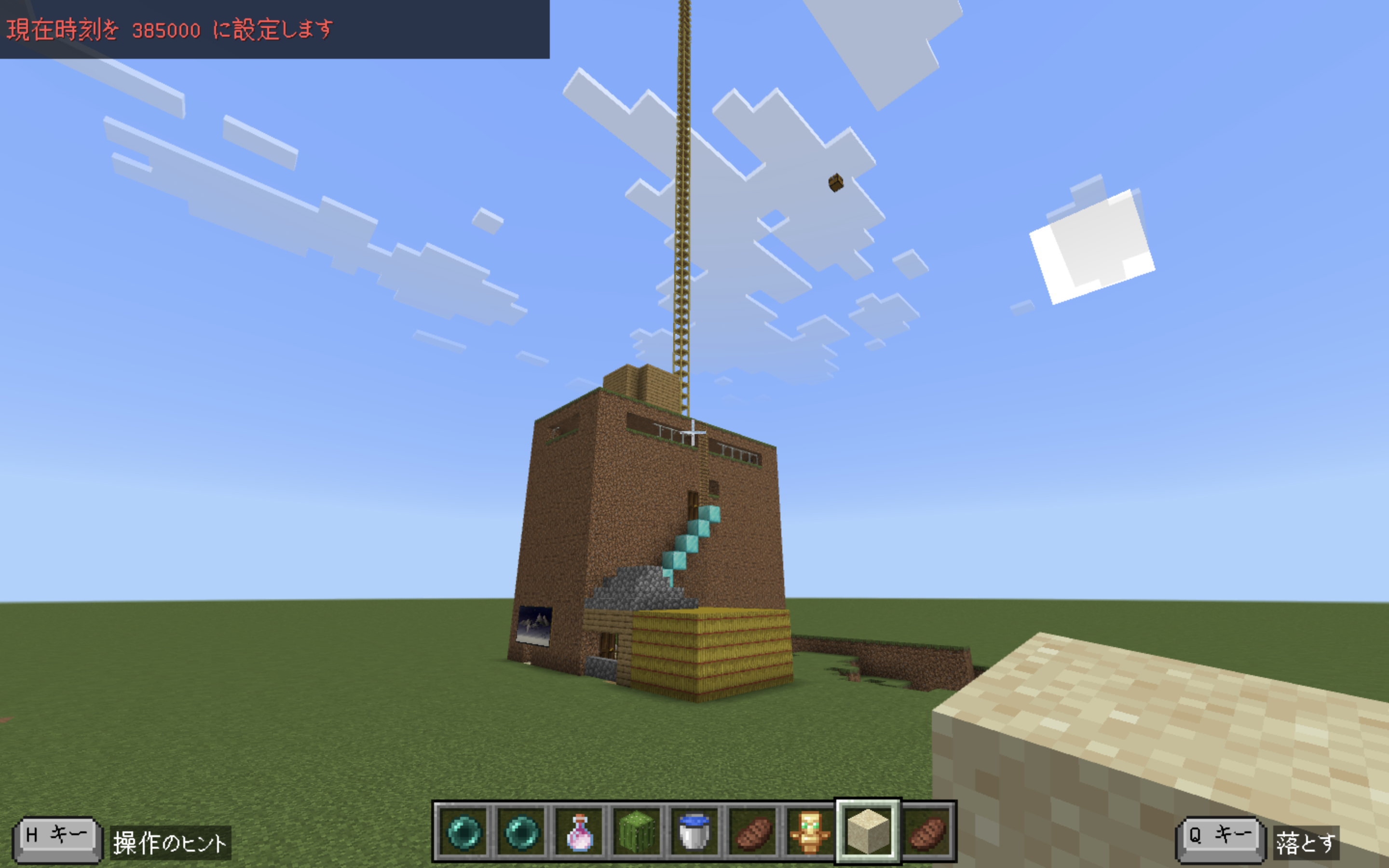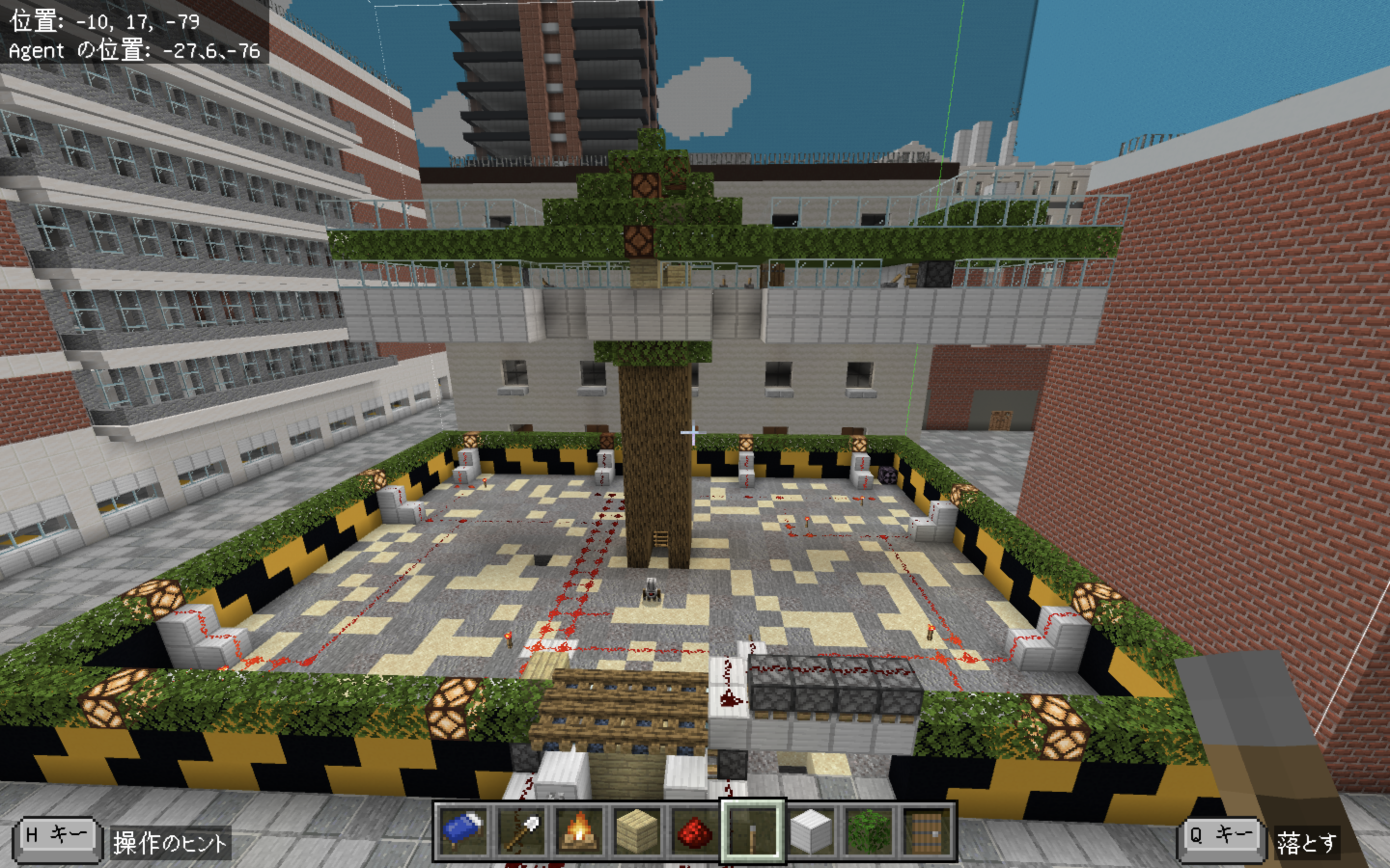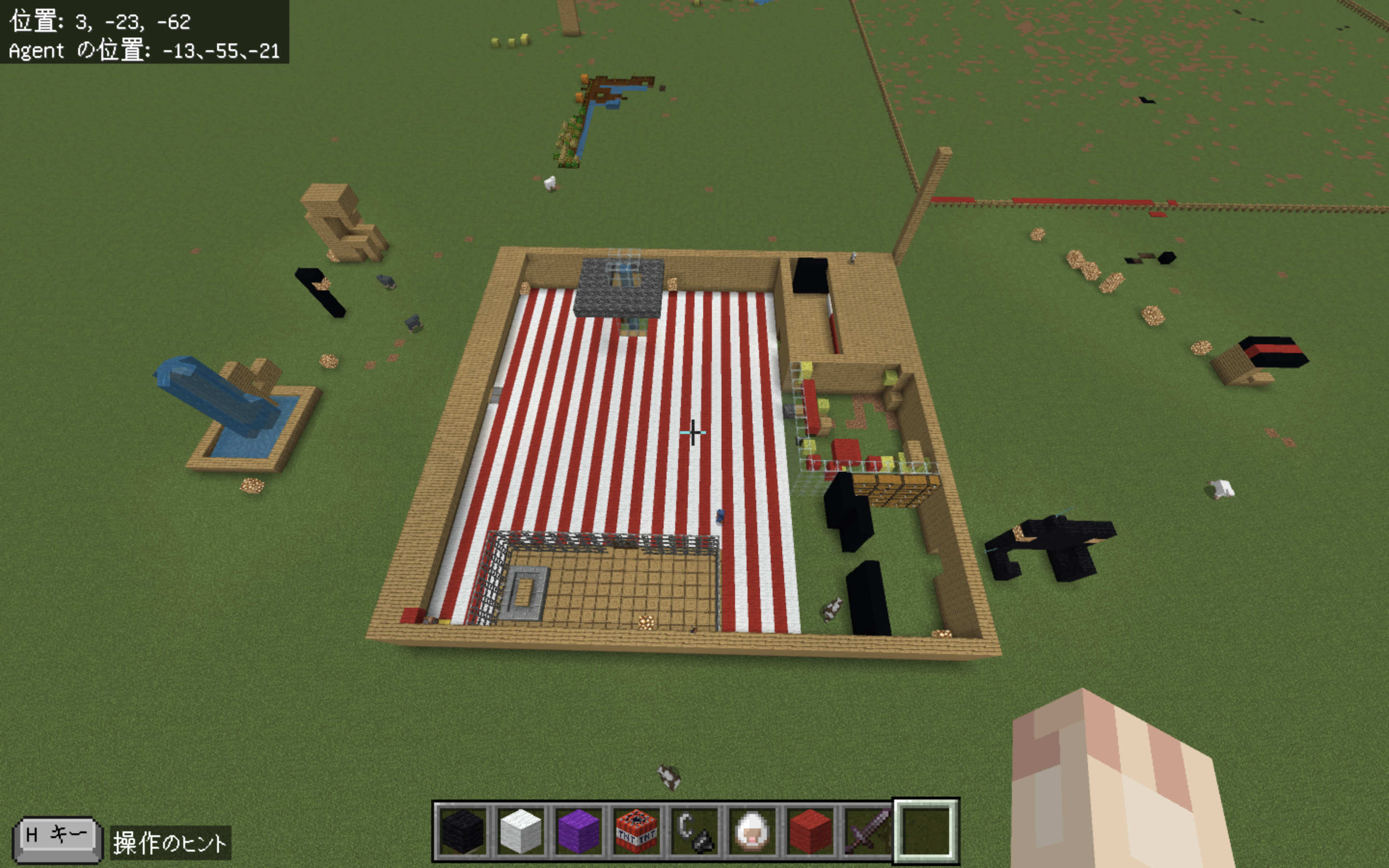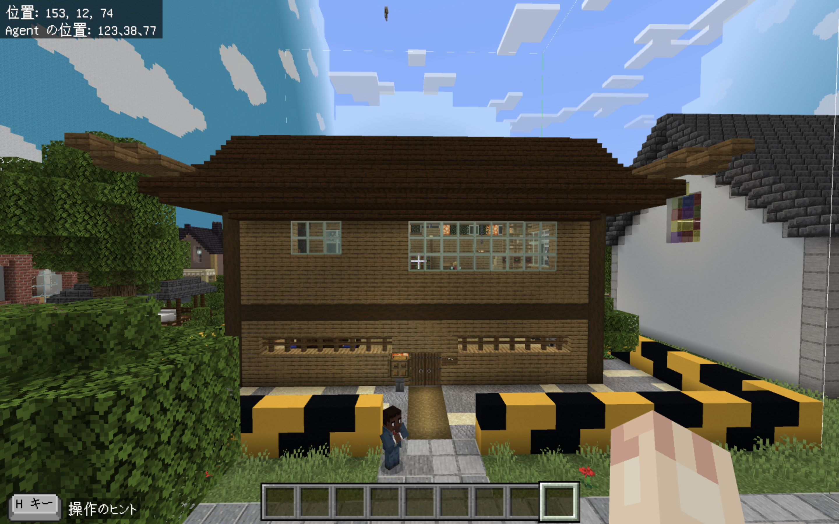 赤と白のブロックを使って、おしゃれで印象的な床のデザインを制作してくれました。今回は製作途中での提出となりましたが、面白い仕組みを取り入れようとする工夫が随所に見られました。マインクラフトでおなじみの水流エレベーターを作るなど、アイデアを形にしようとする姿勢が印象的です。屋根の一部分ではプログラミングに挑戦し、エージェントを使って屋根を制作するプログラムを作成してくれました。今後の挑戦も楽しみにしています。